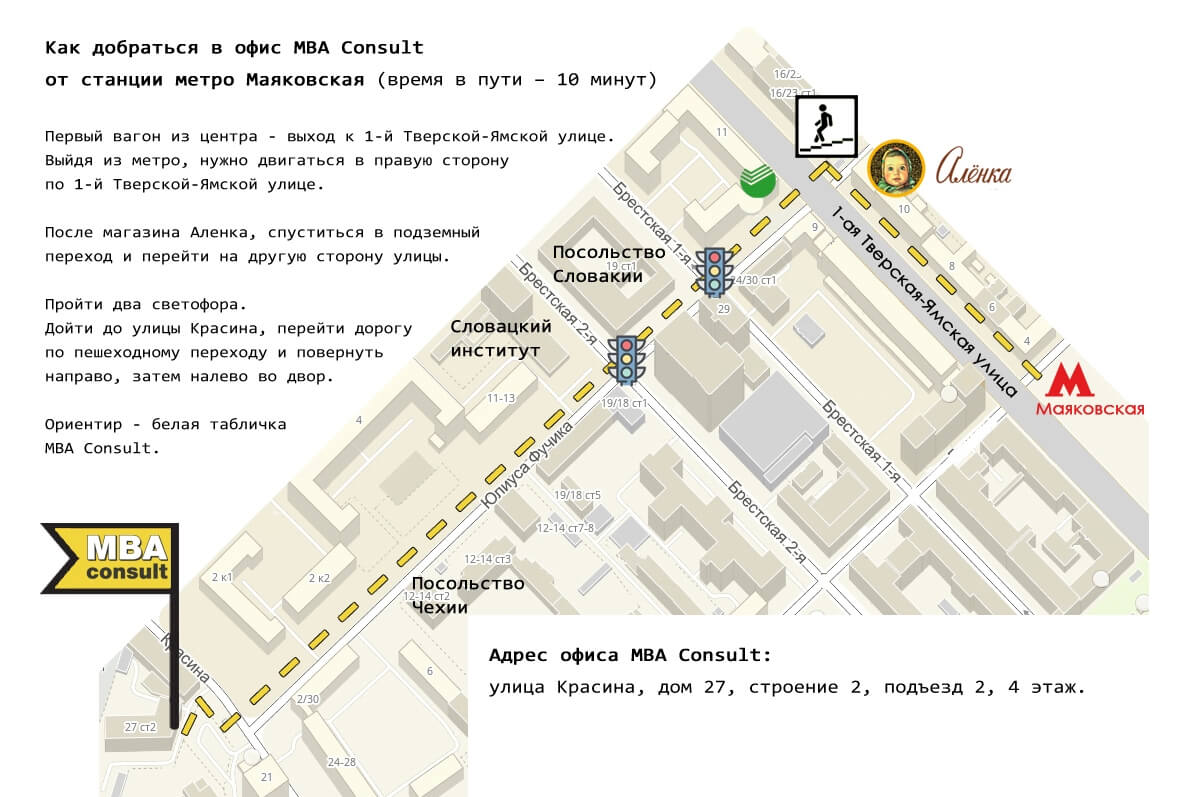 Первый вагон из центра - выход к 1-й Тверской-Ямской улице. Выйдя из метро, нужно двигаться в правую сторону по 1-й Тверской-Ямской улице.